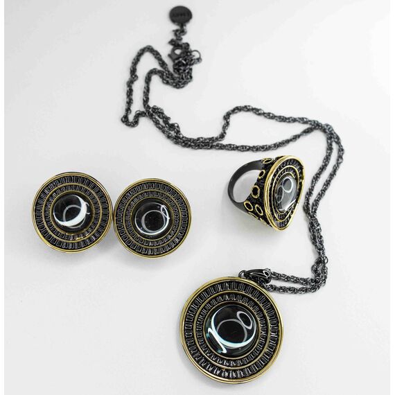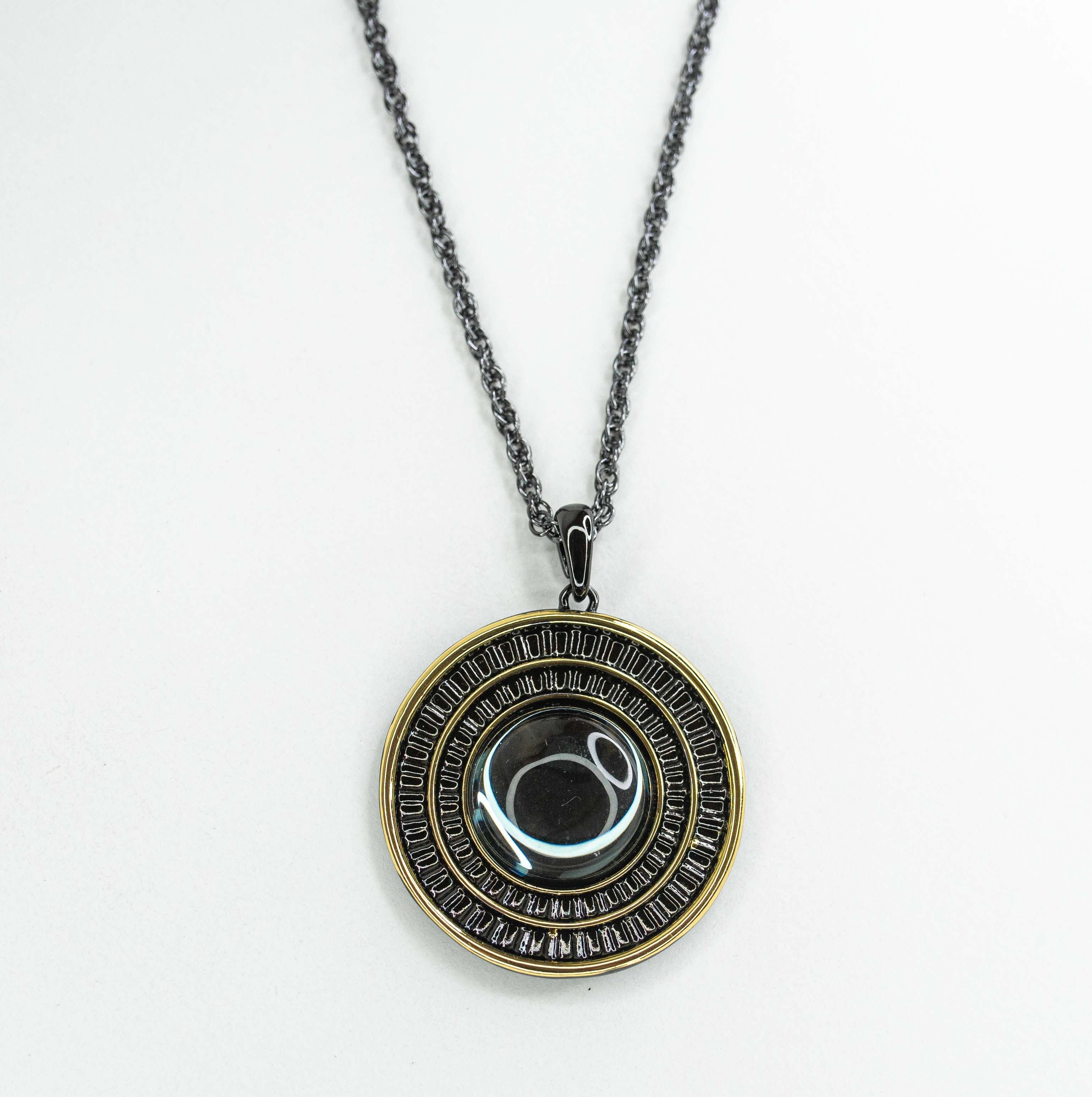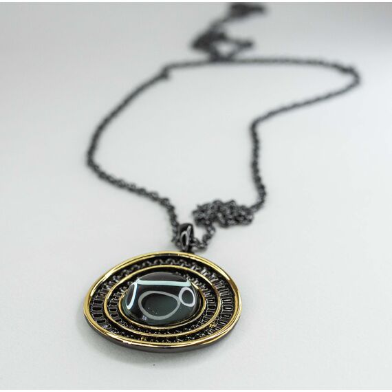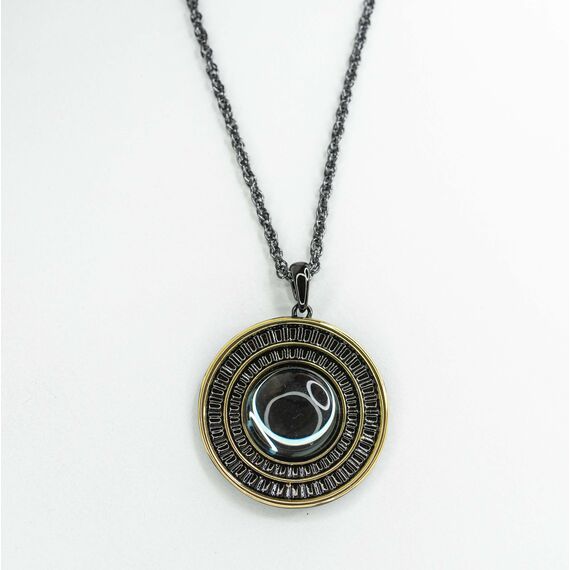 Подвеска ( колье) из гипоаллергенного ювелирного сплава черного и желтого цвета. Вставка- улексит ( кошачий глаз), цвет- серый. Высота подвески-5,0см, ширина-4,5см. Длина кордовой цепи-55,0+5см. замок- карабин.
