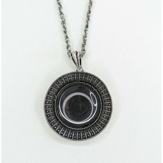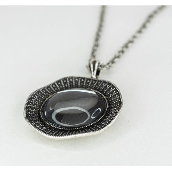 Подвеска (колье) из гипоаллергенного ювелирного сплава серого цвета. Вставка- улексит ( кошачий глаз), цвет- серый. Высота подвески-4,0см, ширина-3,5см. Длина кордовой цепи-55,0+5см, замок- карабин.