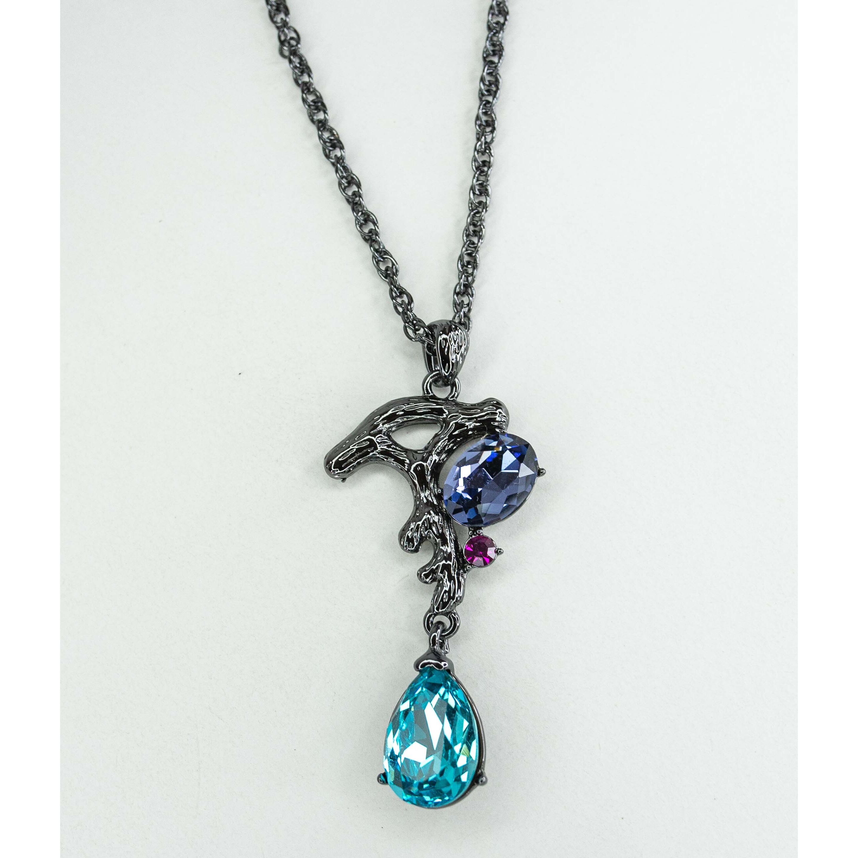 Подвеска ( колье) из гипоаллергенного ювелирного сплава черного цвета. Вставка- ювелирное стекло, цвет- голубой, розовый, сиреневый. Высота подвески-6,0см, ширина-2,0см. Длина кордовой цепи-55,0+5см, замок- карабин.