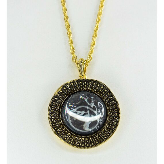 Подвеска (колье) из гипоаллергенного ювелирного сплава желтого и черного цвета. Вставка- улексит (кошачий глаз) , цвет- серый. Высота подвески-4,0см, ширина-3,5см. Длина кордовой цепи-55,0+5см. Замок- карабин.