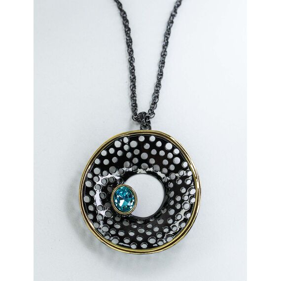 Подвеска (колье) из гипоаллергенного ювелирного сплава черного и желтого цвета. Вставка- кварц, цвет- голубой. Высота подвески-5,0см, ширина-4,0см. Длина кордовой цепи-55,0+5см, замок- карабин.