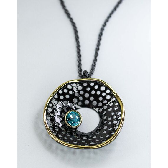 Подвеска (колье) из гипоаллергенного ювелирного сплава черного и желтого цвета. Вставка- кварц, цвет- лондон блю. Высота подвески-5,0см, ширина-4,0см. Длина кордовой цепи-55,0+5см, замок- карабин.