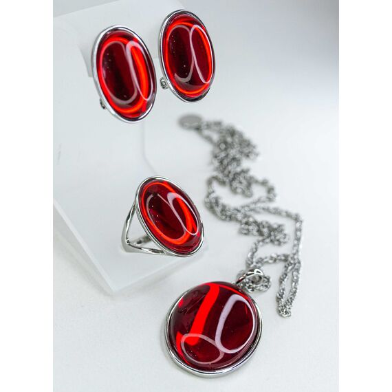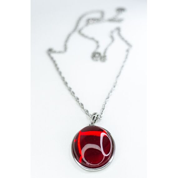Подвеска (колье) из гипоаллергенного ювелирного сплава серого цвета. Вставка- улексит красного цвета. Высота подвески-5,0см, ширина-3,0см. Длина кордовой цепи-55,0+5см, замок- карабин.