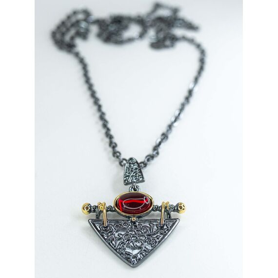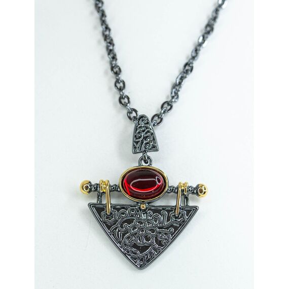 Подвеска (колье) из гипоаллергенного ювелирного сплава серого и желтого цвета. Вставка- кварц красного цвета. Высота подвески-5,0см, ширина-4,0см. Длина якорной цепи-55,0+5см, замок- карабин.