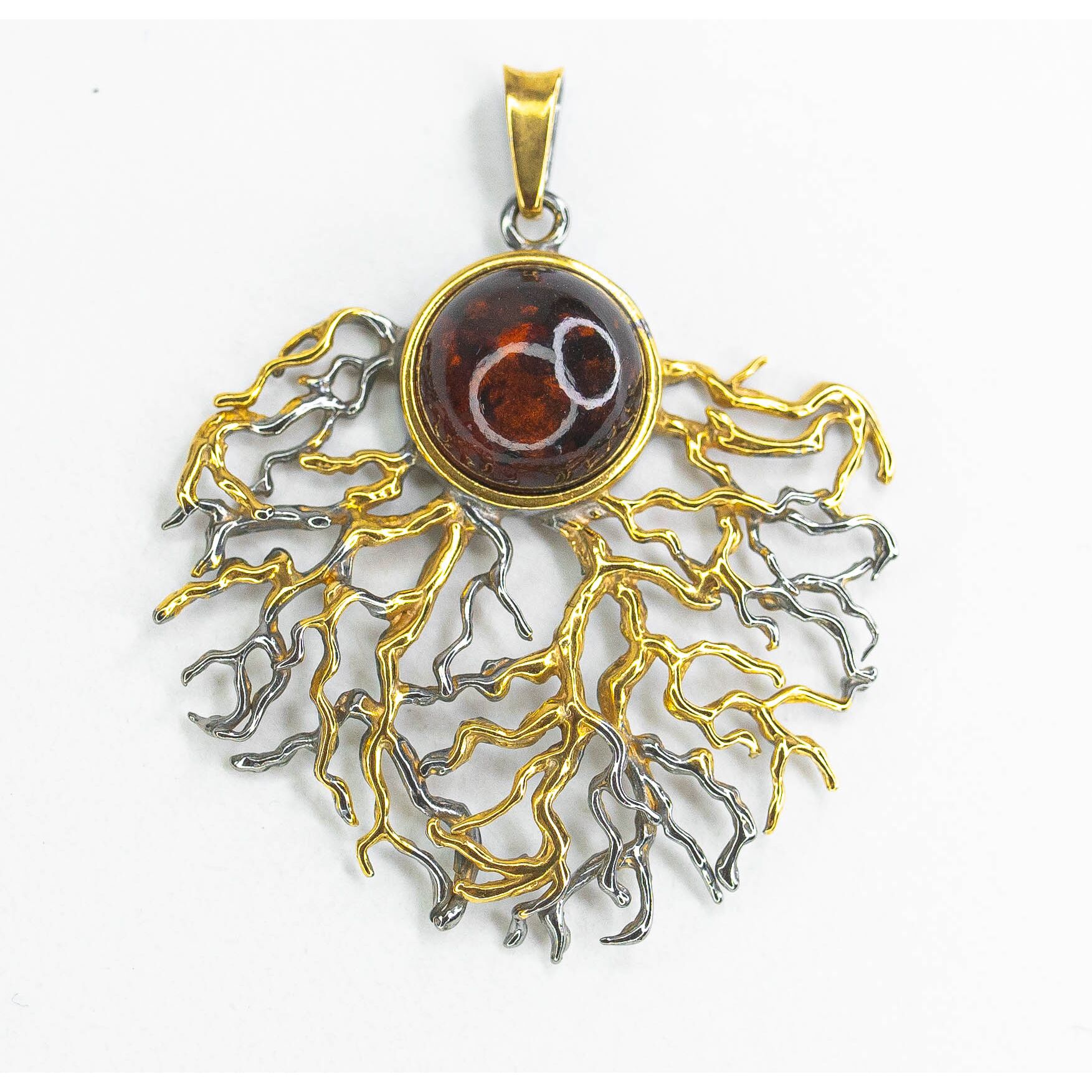 Подвеска женская из гипоаллергенной бронзы с чернением и позолотой. Вставка- нат.янтарь коричневого цвета ( размер камня-1,0/1,0см). Высота подвески-5,0см, ширина-3,0см.