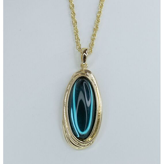 Подвеска женская ( колье) из гипоаллергенного ювелирного сплава желтого цвета. Вставка- улексит, цвет- синий. Высота подвески-5,0см, ширина-2,5см. Длина кордовой цепи-55,0+5,0см, замок- карабин.