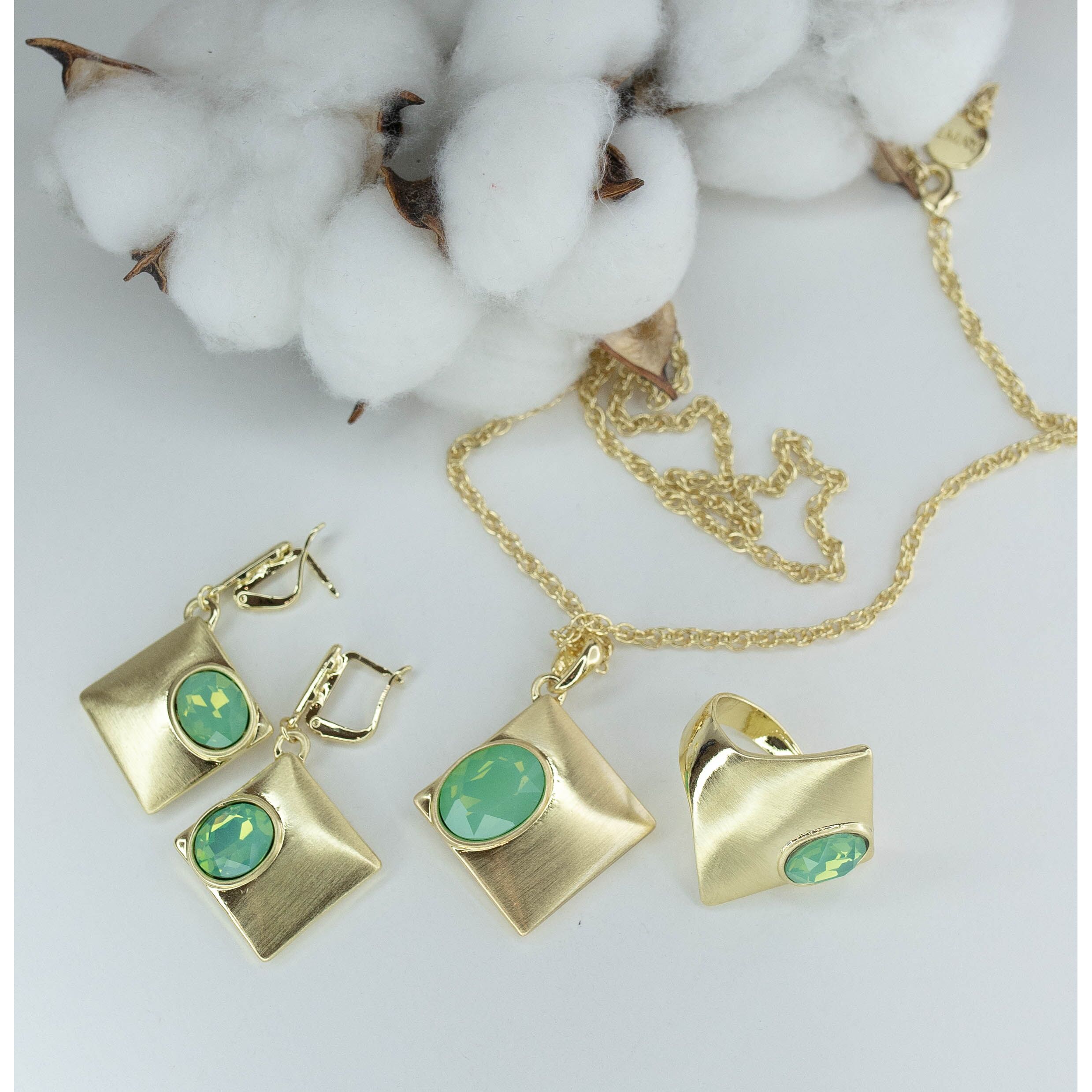 Подвеска женская из гипоаллергенного ювелирного сплава желтого цвета. Вставка- зеленый улексит (кошачий глаз). Высота подвески- 5,0см, ширина-3,0см. Длина кордовой цепи-55,0см с цепочкой на удлинение. Замок- карабин.