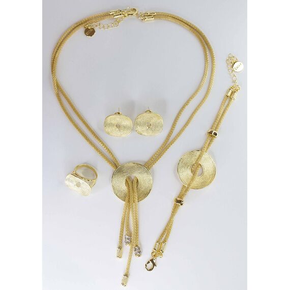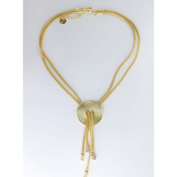 Подвеска женская ( колье) из гипоаллергенного ювелирного сплава желтого цвета. Без вставок. Длина колье-50,0см с удлинением и замком- карабин. В центре круглая подвеска диаметром-4,0см.