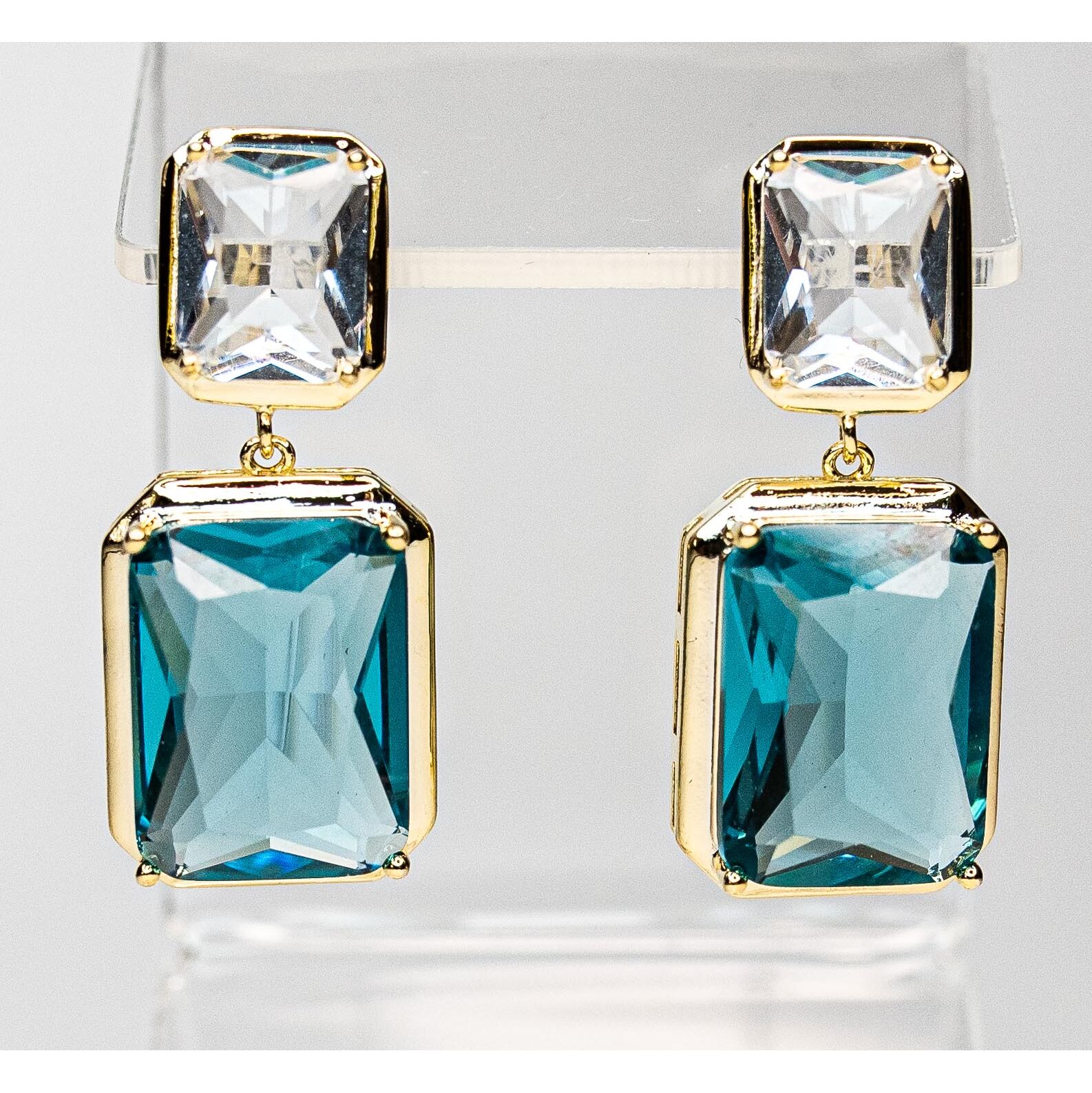 Серьги из гипоаллергенного ювелирного сплава желтого цвета. Вставка- ювелирное стекло белого и голубого цвета. Высота серег-3см, ширина-1,5см. Застежка-пусет.