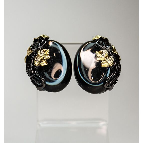 Серьги из гипоаллергенного ювелирного сплава черного и желтого цвета. Вставка- улексит( кошачий глаз) серого цвета. Высота серег-3см, ширина-2,5см. Итальянский замок ( швенза-1,2см и застежка-клипса).