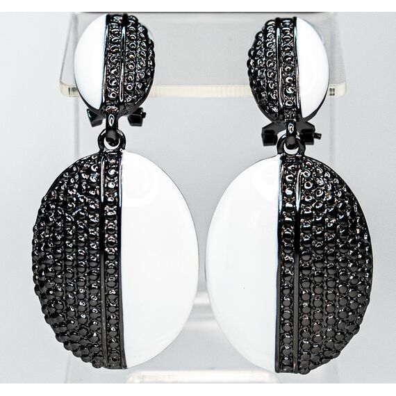 Серьги из гипоаллергенного ювелирного сплава черного цвета. Без вставок. Покрытие- эмаль белого цвета. Итальянский замок( швенза-1,2см и застежка-клипса). Высота серег-5,5см, ширина-2,5см.