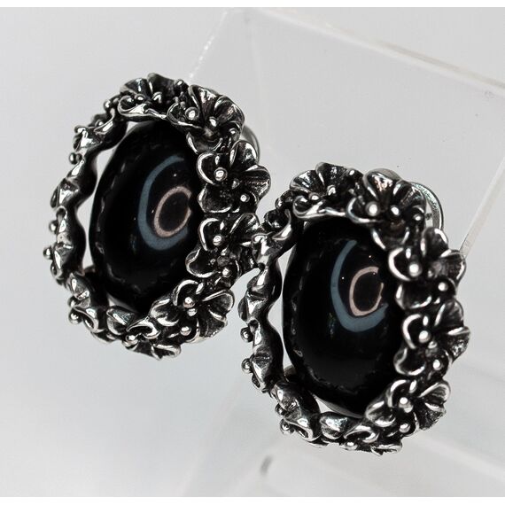Серьги из гипоаллергенного ювелирного сплава серого вета. Вставка-пластик черного цвета. Итальянский замок (швенза-1,2см и застежка-клипса). Высота серег-3см, ширина-2,5см. Размер камня-2/1,5см.