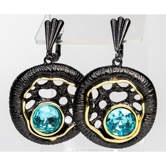 Серьги из гипоаллергенного ювелирного сплава черного и желтого цвета. Вставка- ювелирное стекло ( диаметр камня-1,3см) ,цвет- голубой. Высота серег-4,5см, ширина-3см.Английский замок( швенза-1см).