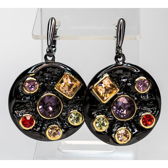 Серьги из гипоаллергенного ювелирного сплава черного цвета. Вставка - ювелирное стекло, цвет - красный, оранжевый. сиреневый. светло-зеленый. Английский замок (швенза-1см). Высота серег - 4,5см, ширина - 3см.