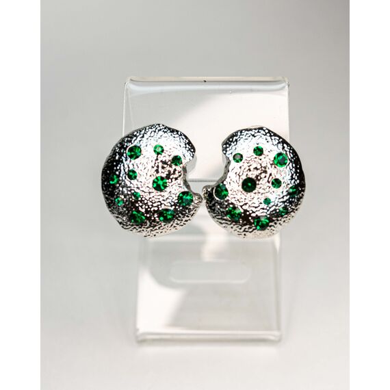 Серьги из гипоаллергенного ювелирного сплава серого цвета . Вставка- ювелирное стекло зеленого цвета. Итальянский замок (швенза-1,2см и застежка-клипса). Высота серег-2,5см, ширина-2см.
