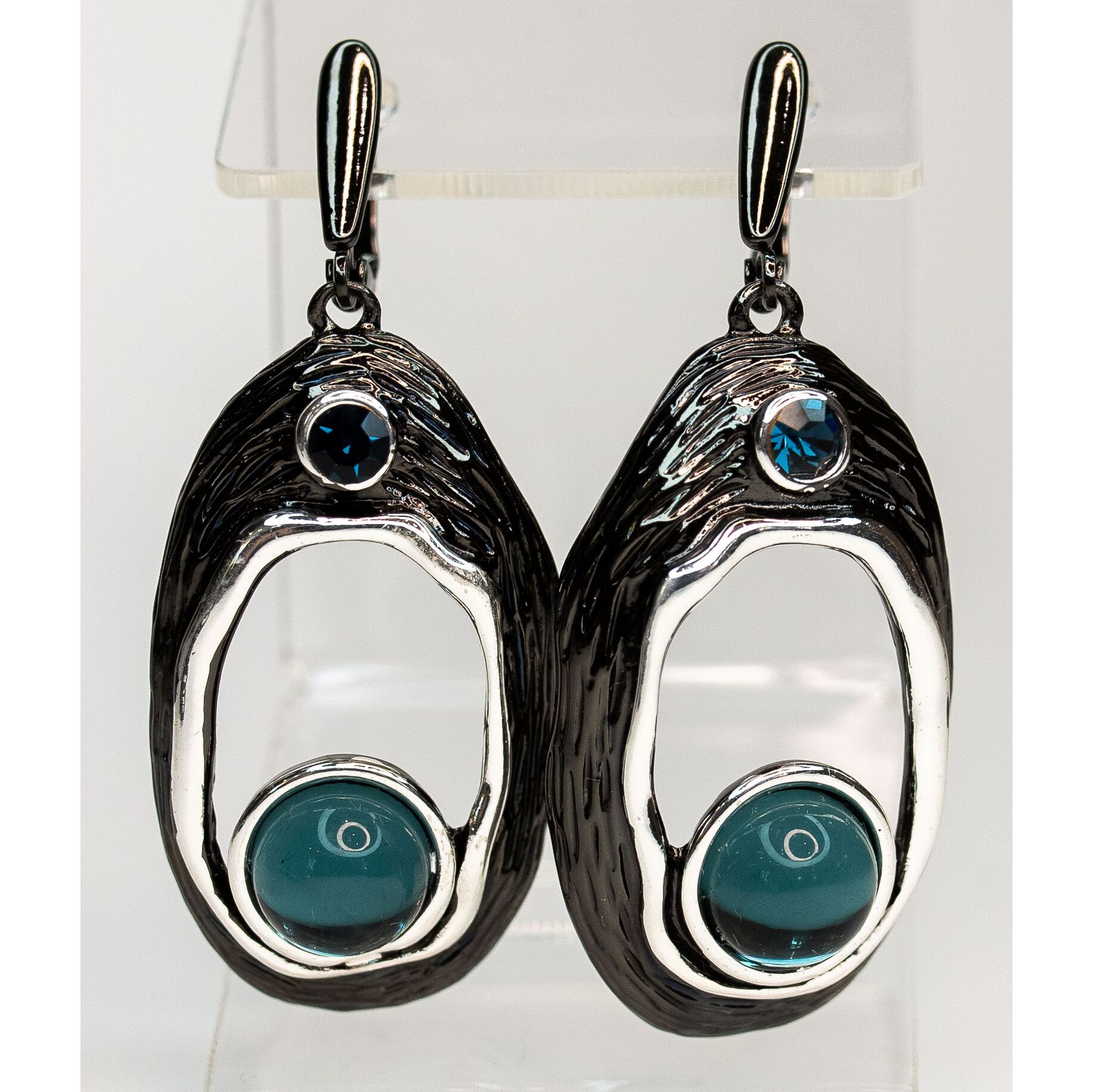 Серьги из гипоаллергенного ювелирного сплава черного и серого цвета. Вставка- улексит ( кошачий глаз, диаметр камня-1см) цвета лондон бдю и ювелирное стекло,цвет- синий. Высота серег-5,5см, ширина-2см. Английский замок( швенза-1см).