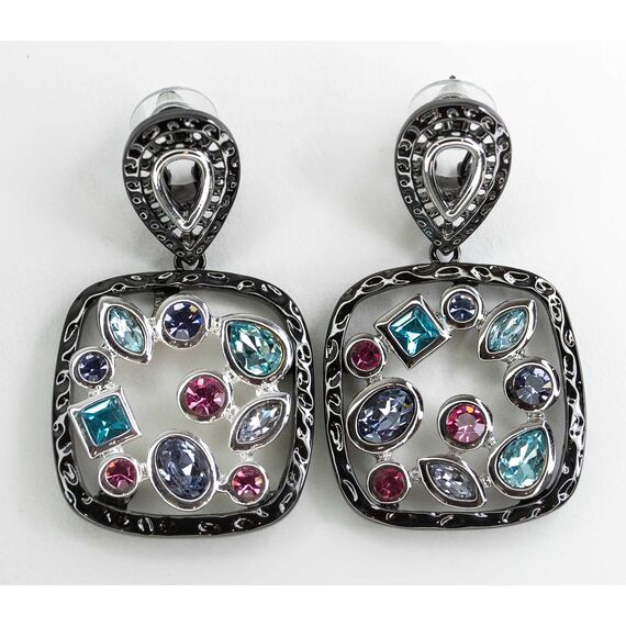 Серьги женские из гипоаллергенного ювелирного сплава черного цвета. Вставка- ювелирное стекло, цвет- розовый, голубой и сиреневый. Высота серег- 5,0см, ширина- 3,0см. Итальянский замок ( штифт-1,2см и клипса).