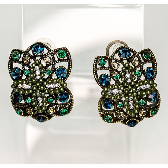 Серьги из гипоаллергенного ювелирного сплава бронзового цвета. Вставка- ювелирное стекло, цвет- зеленый, синий. желтый. Высота серег-2,5см, ширина-2см. Итальянский замок ( швенза-1,2см и застежка- клипса).