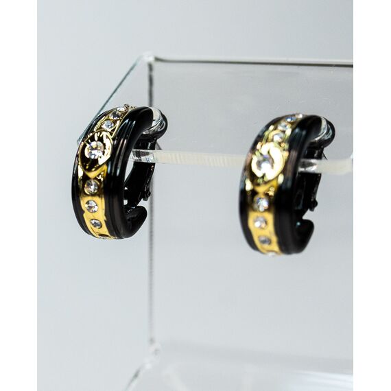 Серьги из гипоаллергенного ювелирного сплава желтого и черного цвета. Вставка- ювелирное стекло белого цвета. Высота серег-2см, ширина-0,6см. Итальянский замок ( швенза-1,2см и застежка- клипса).
