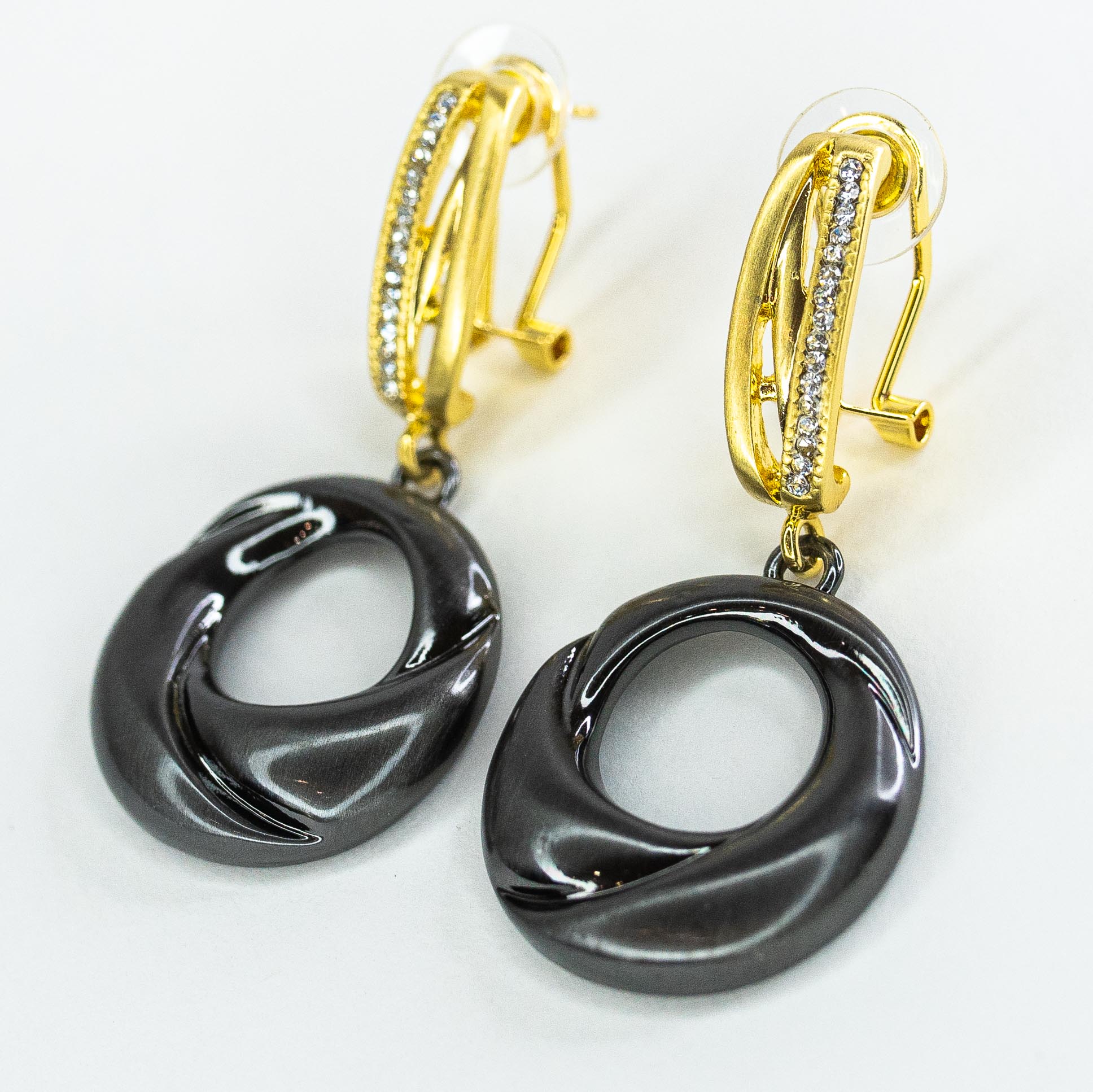Серьги из гипоаллергенного ювелирного сплава черного и желтого цвета. Вставка- ювелирное стекло белого цвета. Высота серег-5,5см, ширина-2,5см. Итальянский замок ( швенза- 1,2см и застежка- клипса).