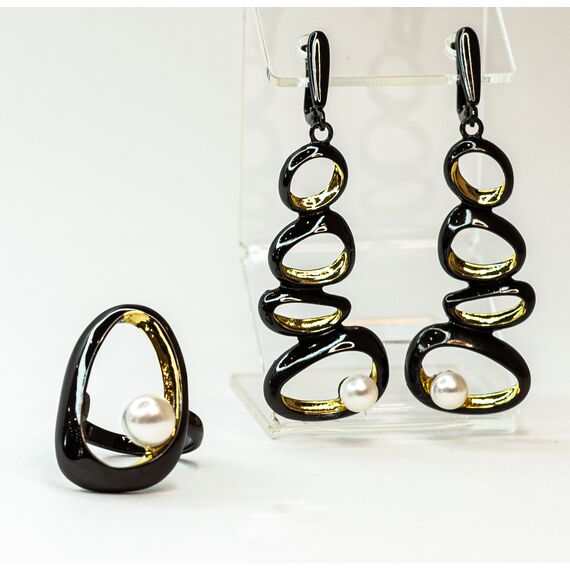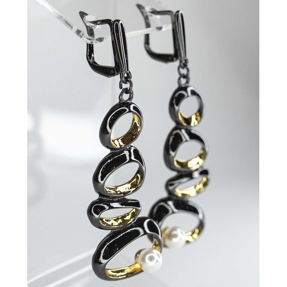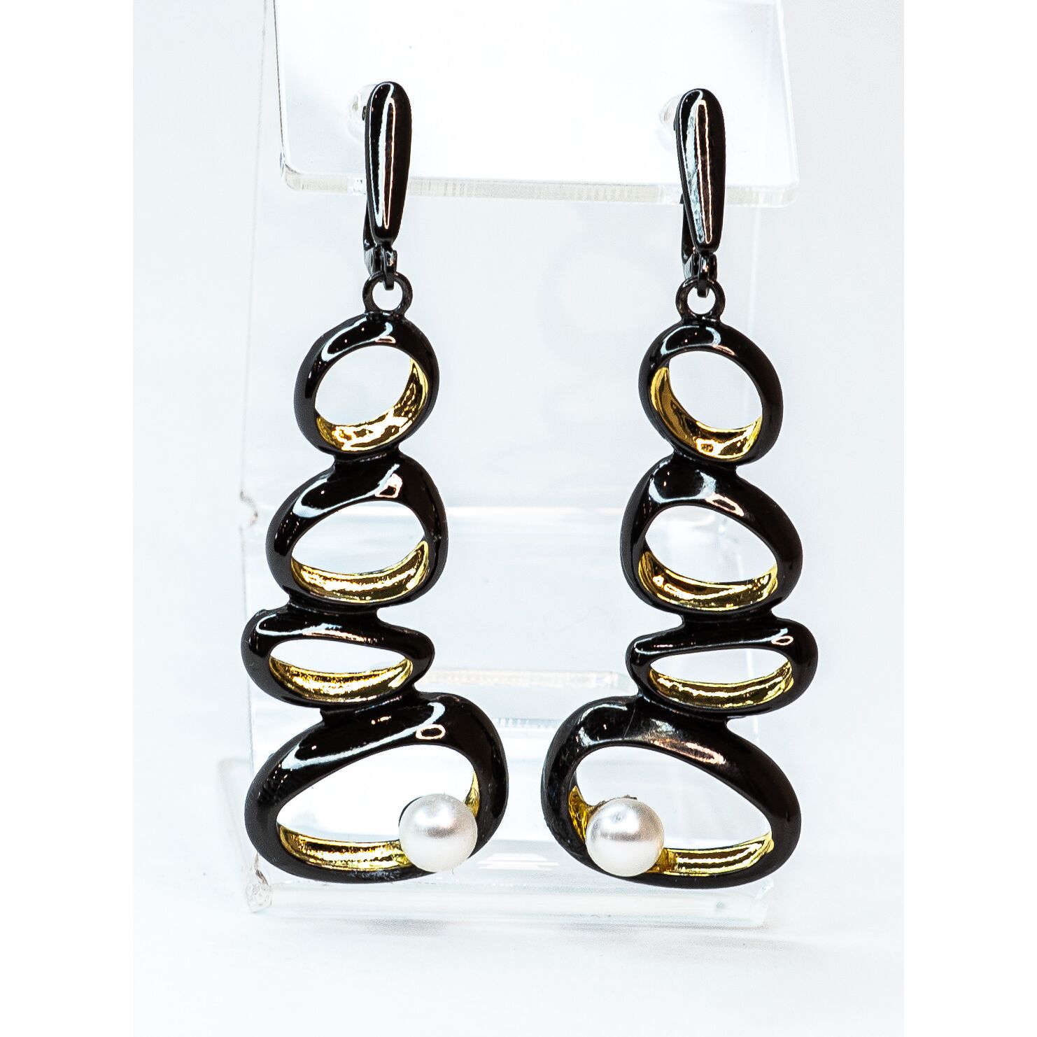 Серьги из гипоаллергенного ювелирного сплава, цвет-черный, желтый. Вставка- иск. жемчуг белого цвета. Английский замок (швенза- 1см), Высота серег-6см, ширина-2см.