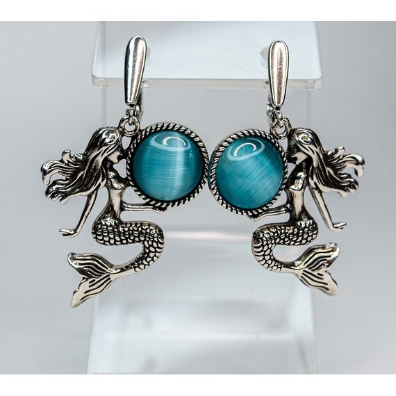 Серьги из гипоаллергенного ювелирного сплава ,цвет-серый .Вставка-улексит(кошачий глаз) голубого цвета , диаметр камня- 1,3см. Английский замок (швенза-1см ).Высота серег-4,5см,ширина-2,5см.