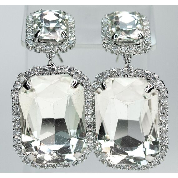 Серьги женские из гипоаллергенного ювелирного сплава серого цвета. Вставка- ювелирное стекло белого цвета. Высота серег--3,5см, ширина- 2,0см. Замок- пусет.