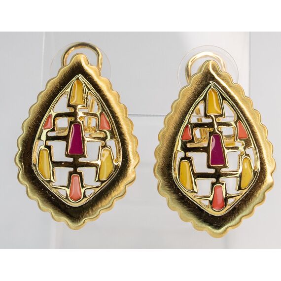 Серьги из гипоаллергенного ювелирного сплава желтого цвета. Без вставок. Покрытие эмалью красного и желтого цвета. Высота серёг-3,2см, ширина-2см. Итальянский замок( швенза-1,2см и застежка-клипса).