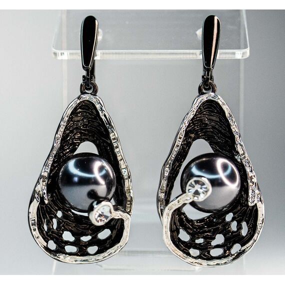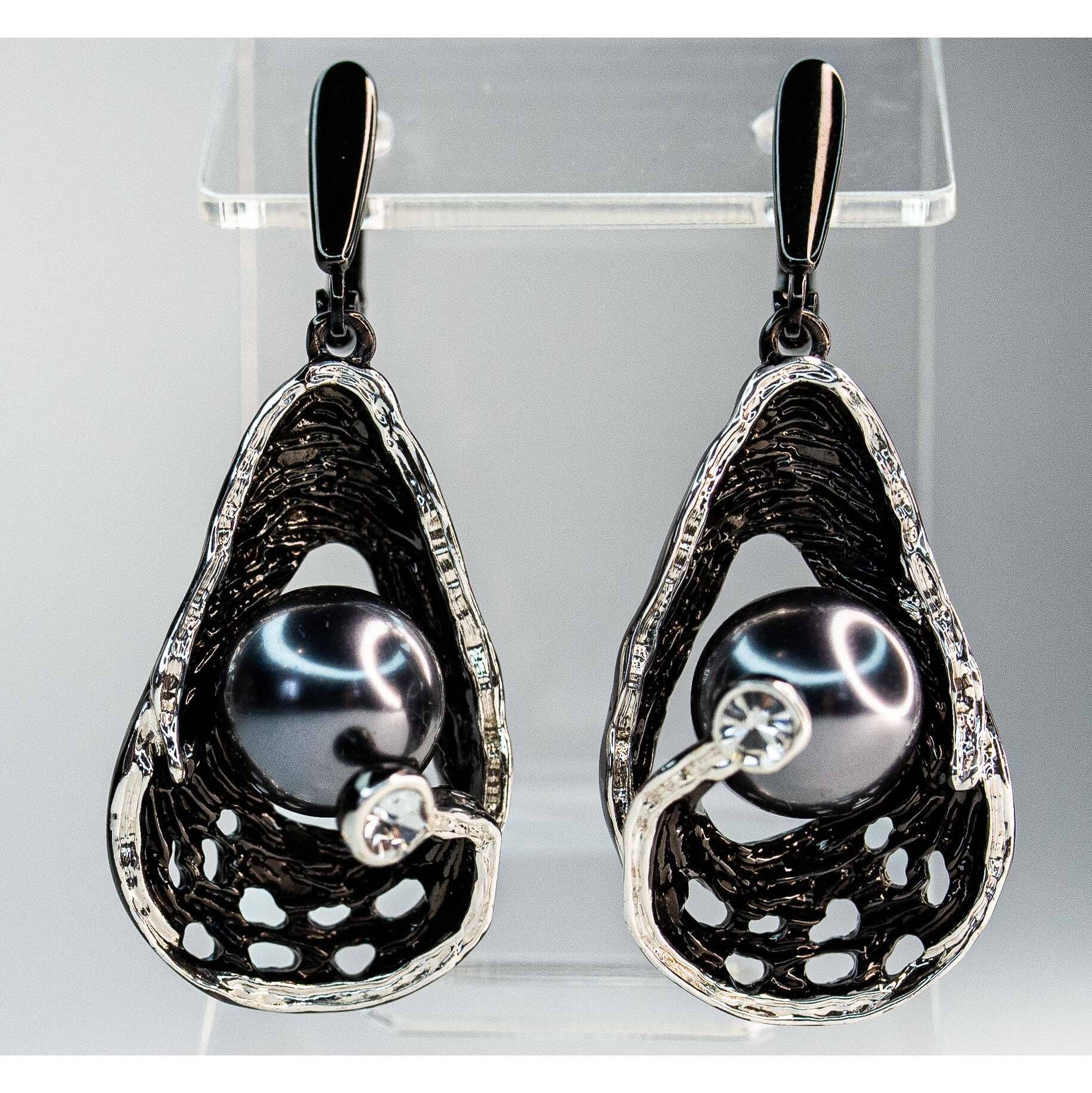 Серьги из гипоаллергенного ювелирного сплава ,цвет-черный. Вставка-иск. жемчуг серого цвета (диаметр жемчуга-1см) и ювелирное стекло белого цвета . Английский замок (швенза-1см) .Высота серьги -4,5см,ширина-2см.