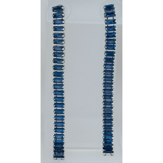 Серьги из гипоаллергенного ювелирного сплава серого цвета. Вставка- ювелирное стекло, цвет- синий. Высота серег-7,0см, ширина-0,5см. Застежка- пусет.