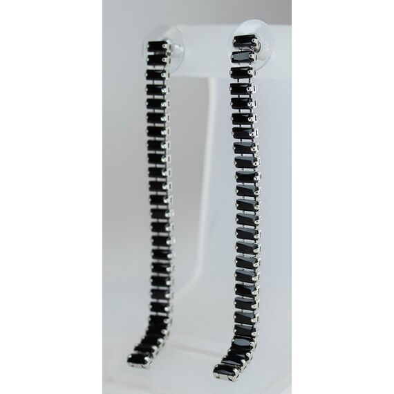 Серьги из гипоаллергенного ювелирного сплава серого цвета. Вставка- ювелирное стекло, цвет- черный. Высота серег-5,0см, ширина-0,5см. Застежка- пусет.