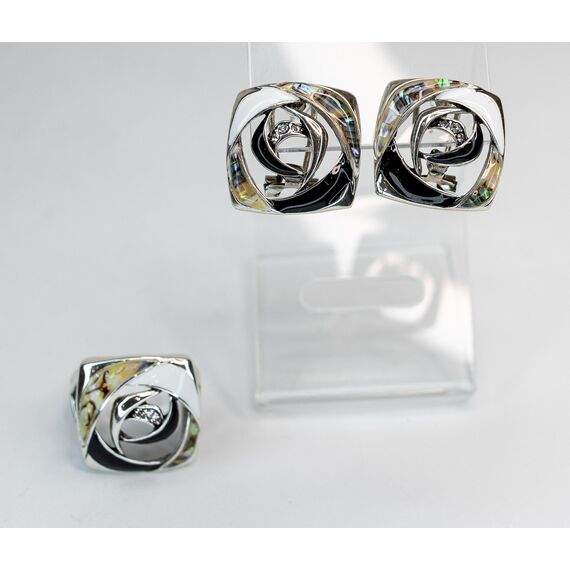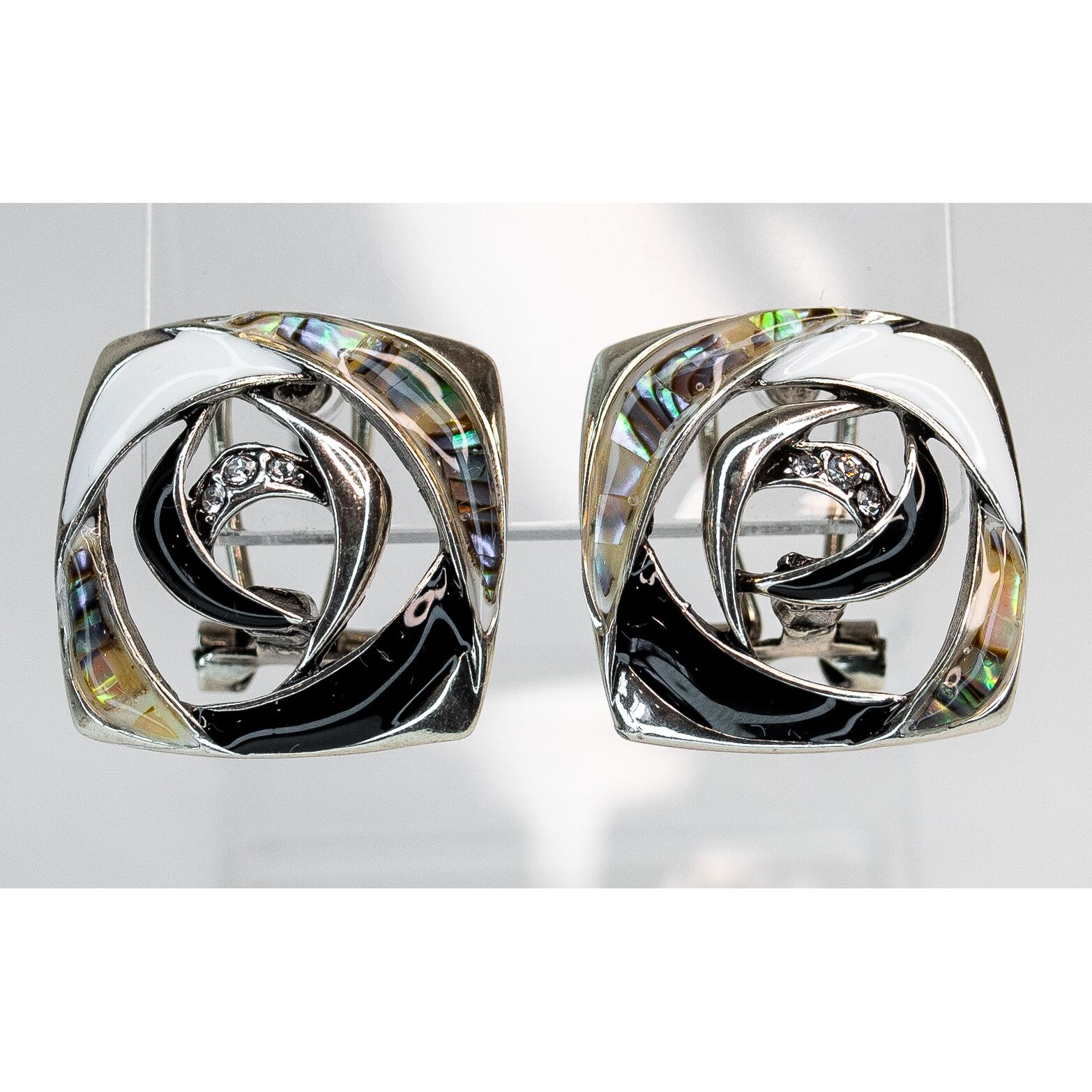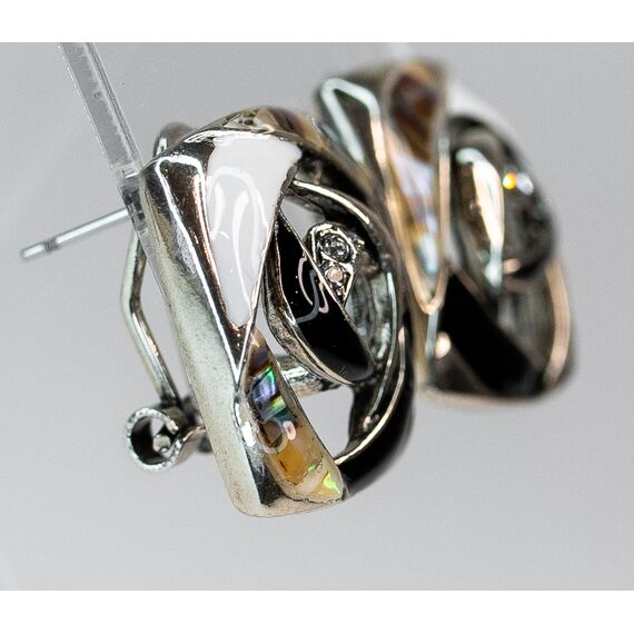 Серьги из гипоаллергенного ювелирного сплава серого цвета. Вставка- ювелирное стекло, цвет-белый. Покрытие эмалью черного и белого цвета. Высота серег-2,0см, ширина-2,0см. Итальянский замок ( швенза-1,2см и застежка- клипса).