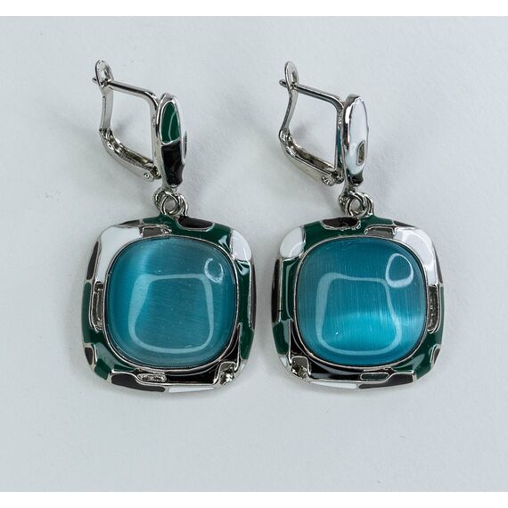 Серьги из гипоаллергенного ювелирного сплава серого цвета. Вставка- улексит( кошачий глаз) голубого цвета. Покрытие эмалью, цвет-зелёный, белый,черный. Английский замок ( швенза-1см). Высота серег-4см, ширина-2см.