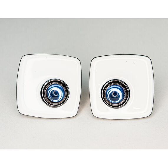 Серьги из гипоаллергенного ювелирного сплава черного цвета. Покрытие эмалью белого цвета. Вставка- улексит (кошачий глаз), цвет- голубой, диаметр камня-0,8см. Высота серег-2,5см, ширина-2,5см. Итальянский замок( швенза-1,2см и застежка-клипса).