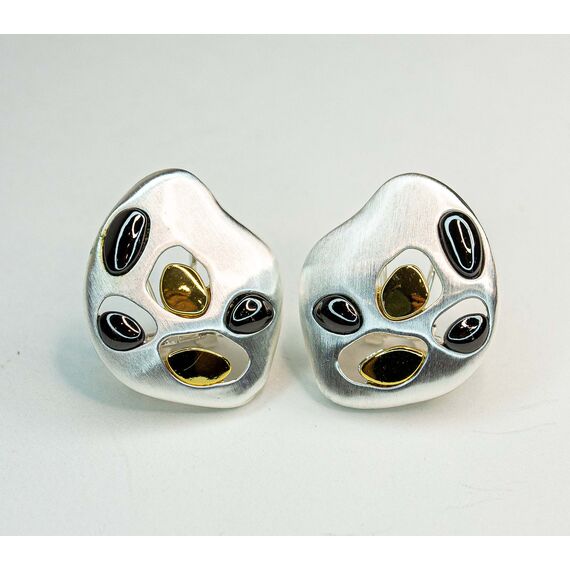 Серьги из гипоаллергенного ювелирного сплава черного,серого и желтого цвета. Без вставок. Итальянский замок ( швенза-1,2см и застежка- клипса). Высота серег-3см, ширина-2,5см.