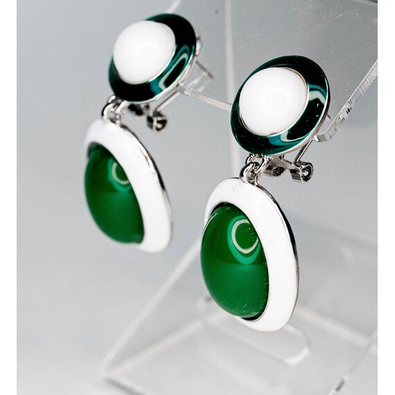 Серьги из гипоаллергенного ювелирного сплава серого цвета. Без вставок. Покрытие эмалью белого и зелёного цвета. Итальянский замок ( швенза-1,2см и застежка- клипса). Высота серег-4см, ширина-2см.