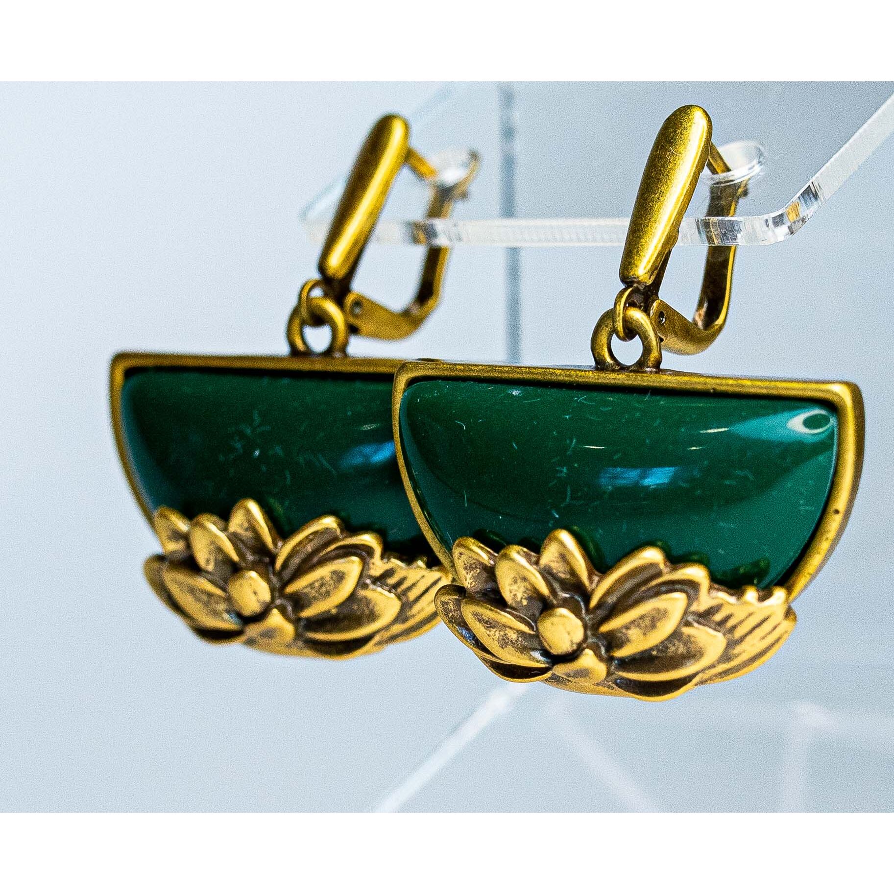 Серьги из гипоаллергенного ювелирного сплава желтого цвета . Вставка- пластик зеленого цвета. Английский замок (швенза-1см ). Высота серег-1,5см, ширина-3см.