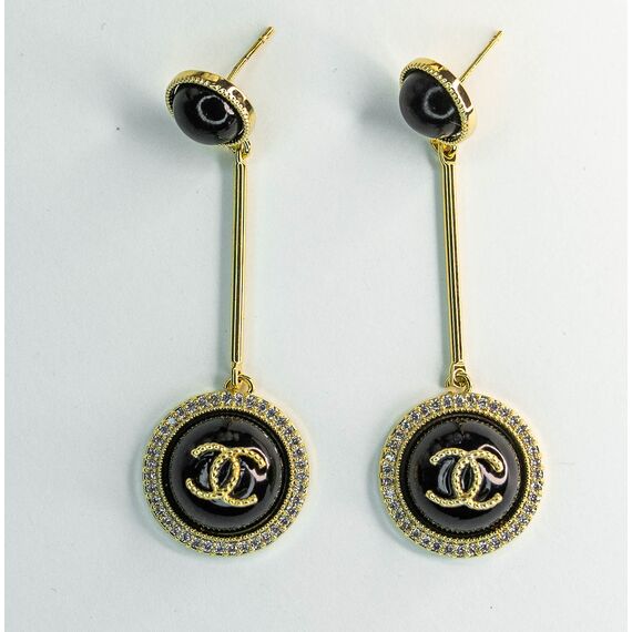 Серьги из гипоаллергенного ювелирного сплава желтого цвета. Вставка - ювелирное стекло белого цвета. Покрытие эмалью черного цвета. Высота серег-5,5см, ширина-1,5см. Застежка- пусет.