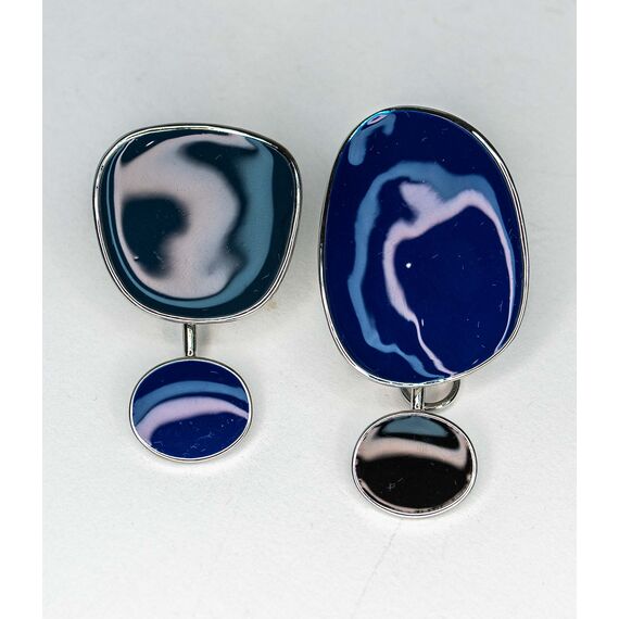 Серьги из гипоаллергенного ювелирного сплава серого цвета. Покрытие эмалью, цвет- черный и синий. Высота серег--4,5 и 5,5см, ширина-2,5см. Итальянский замок( швенза-1,2см и застежка- клипса).