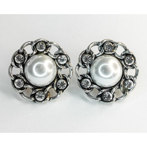 Серьги из гипоаллергенного ювелирного сплава серого цвета. Вставка- ювелирное стекло и иск. жемчуг белого цвета. Застежка- пусет. Высота серег-2,5см, ширина-2,5см.