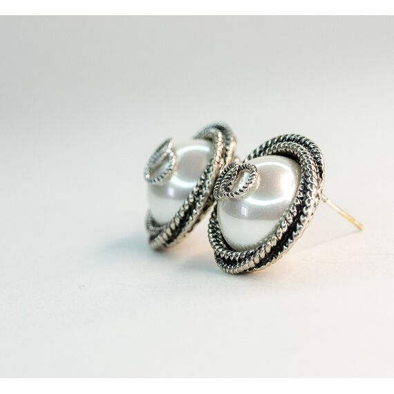 Серьги из гипоаллергенного ювелирного сплава серого цвета. Встака- иск. жемчуг, цвет- белый. Застежка- пусет. Высота серег-2см, ширина-2см.