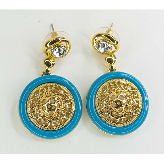 Серьги из гипоаллергенного ювелирного сплава желтого цвета . Вставка- ювелирное стекло белого цвета. Покрытие эмалью,цвет- голубой. Застежка--пусеты (швенза-1,2см ). Высота серег-4,5см, ширина-2,5см.