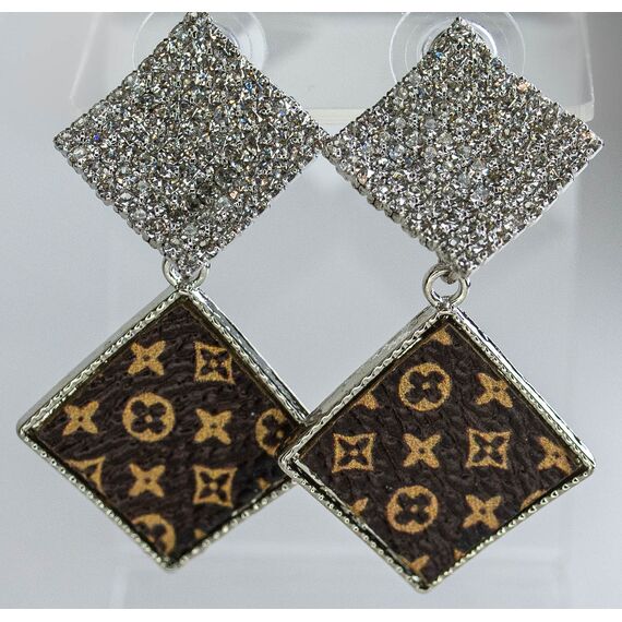 Серьги из гипоаллергенного ювелирного сплава серого цвета. Вставка- иск.кожа коричневого цвета и ювелирное стекло белого цвета. Высота серег-4,5см, ширина-2,5см. Застежка- пусет.