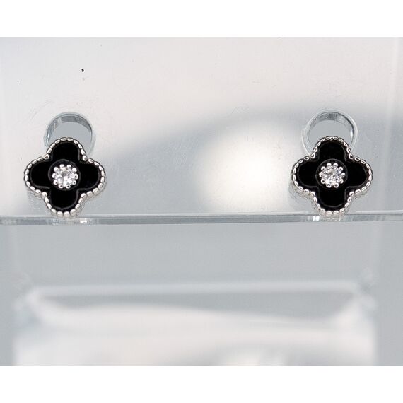 Серьги женские из гипоаллергенного ювелирного сплава серого цвета с покрытием эмалью черного цвета. Вставка- ювелирное стекло, цвет- белый. Высота серег- 1,0см, ширина- 1,0см. Застежка- пусет.