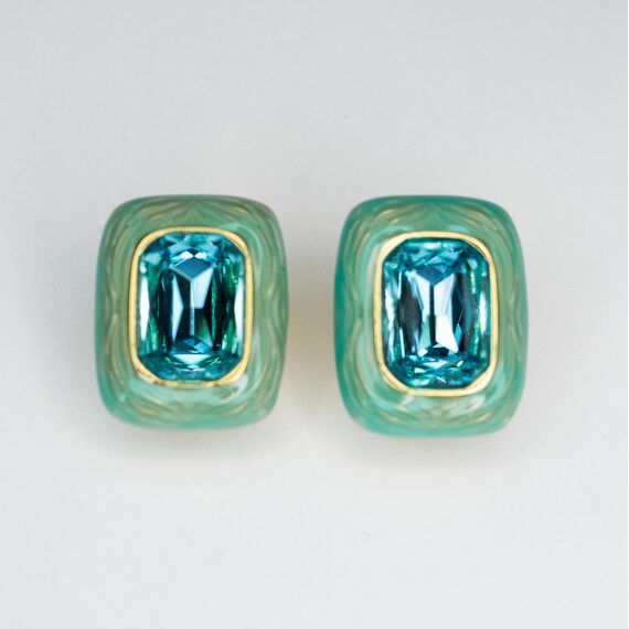 Серьги из гипоаллергенного ювелирного сплава желтого цвета. Покрытие эмалью голубого цвета. Вставка- ювелирное стекло ,цвет- голубой. Высота серег-2см, ширина-1,7см. Итальянский замок ( швенза-1,2см и застежка- клипса).
