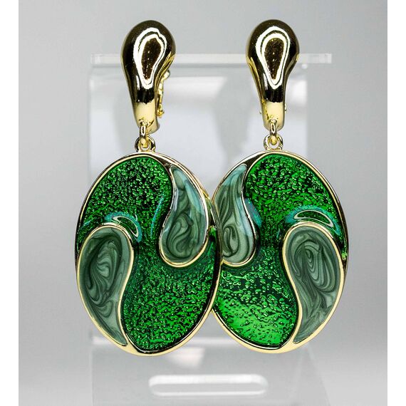 Серьги из гипоаллергенного ювелирного сплава желтого цвета. Покрытие эмалью, цвет- зеленый. Высота серег--5,5см, ширина-2,5см. Итальянский замок( швенза-1,2см и застежка- клипса).