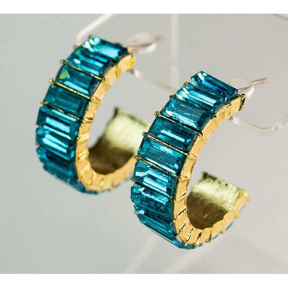 Серьги женские из гипоаллергенного ювелирного сплава желтого цвета. Вставка- ювелирное стекло голубого цвета. Высота серег- 3,0см, ширина- 1,0см. Застежка- пусет.