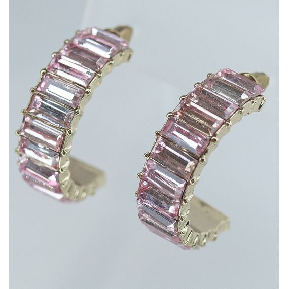 Серьги из гипоаллергенного ювелирного сплава желтого цвета. Вставка- ювелирное стекло розового цвета. Высота серег-2,0см, ширина-0,5см. Застежка- пусет.