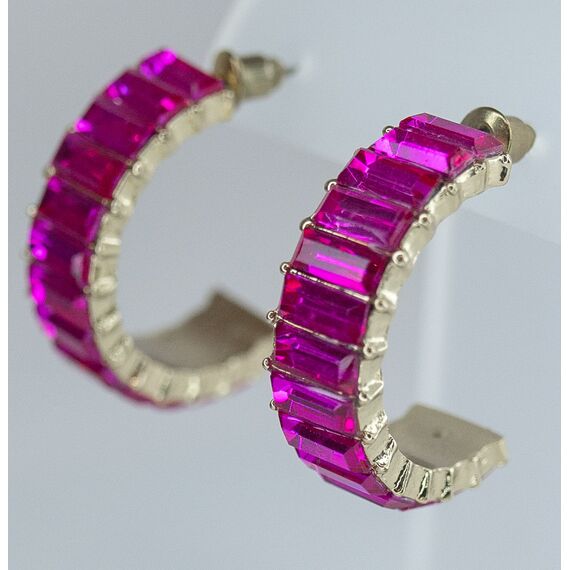 Серьги из гипоаллергенного ювелирного сплава желтого цвета. Вставка- ювелирное стекло, цвет- фуксия. Высота серег-2,0см, ширина-0,5см. Застежка- пусет.