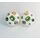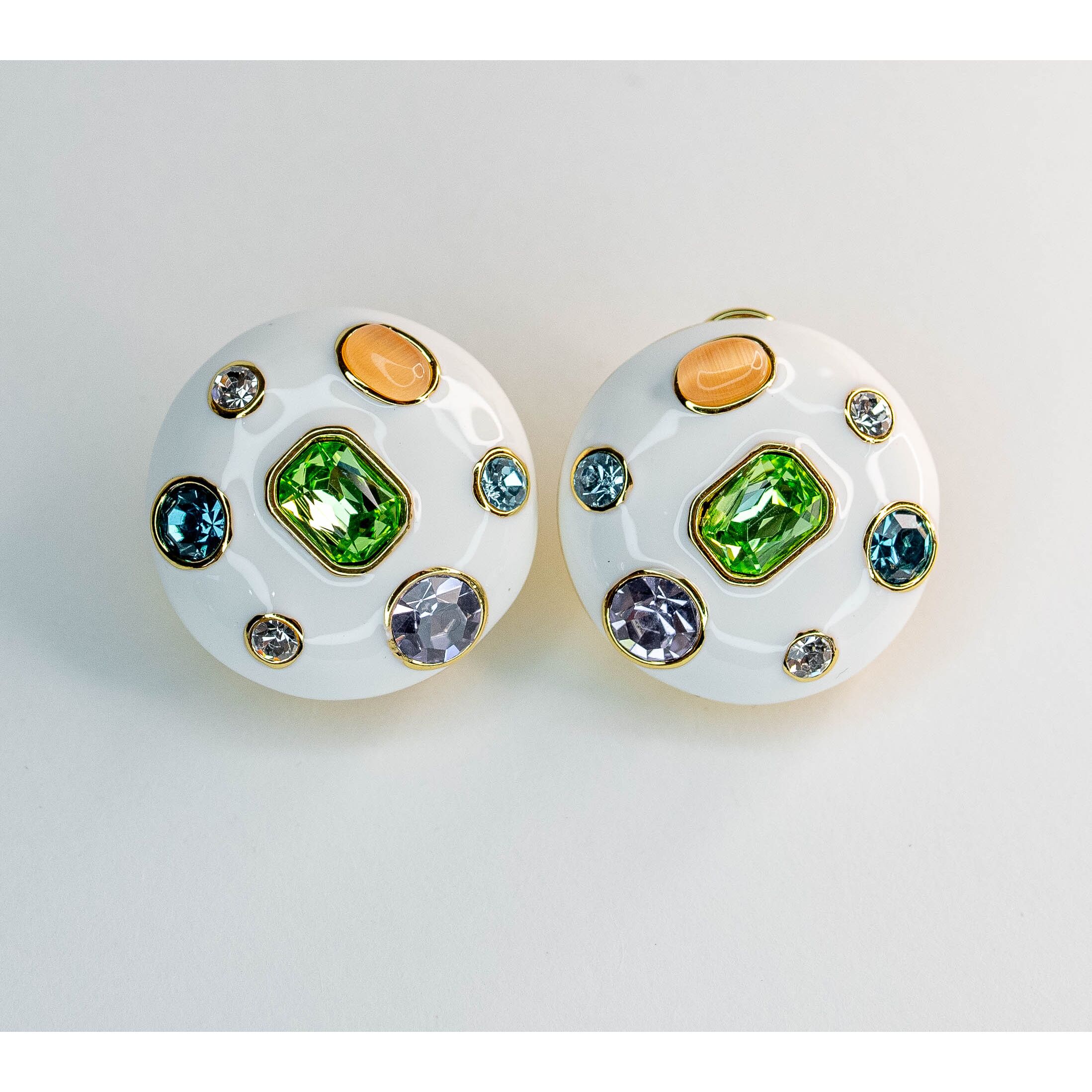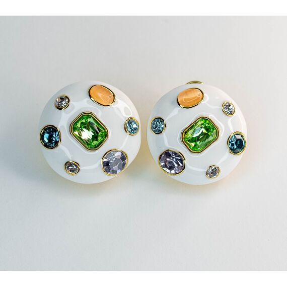 Серьги из гипоаллергенного ювелирного сплава желтого цвета. Покрытие эмалью белого цвета. Вставка - улексит (кошачий глаз), цвет - оранжевый и ювелирное стекло, цвет - белый, голубой, зеленый, сиреневый. Итальянский замок (швенза - 1,2см и застежка - клипса). Диаметр серег - 3см.